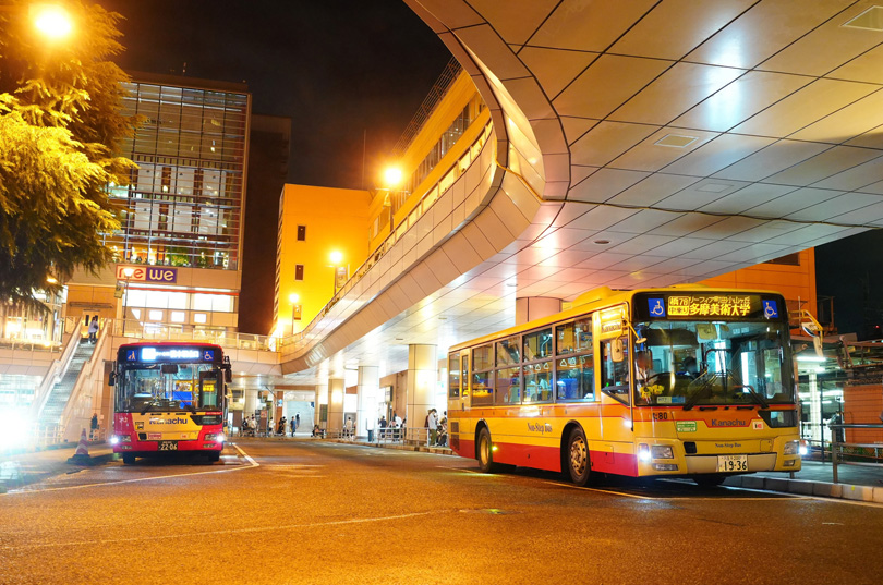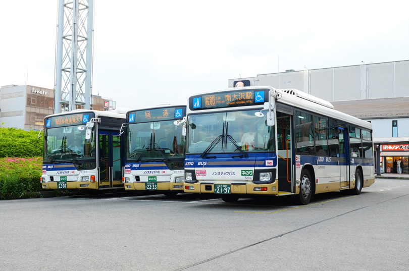 祭の夜の橋本駅に並ぶ、新旧カラーリングの神奈中バス!