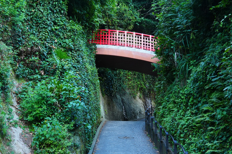 このひっそりとある空気感と、その上を真っ赤な橋が虹のように架かる、この景観がよい!