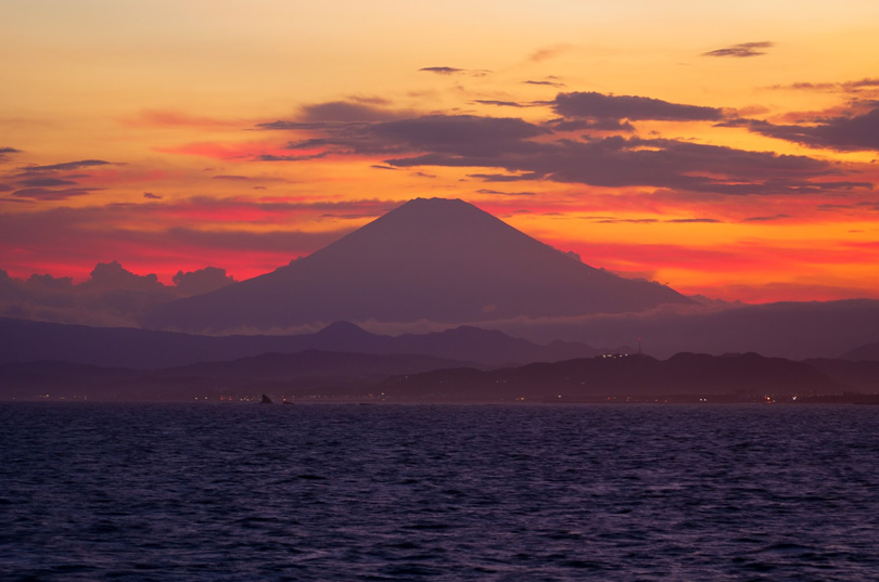 夕焼けの色の中に浮かび上がる富士山の象徴的なシルエットが、貫禄で美しくかっこいい…!