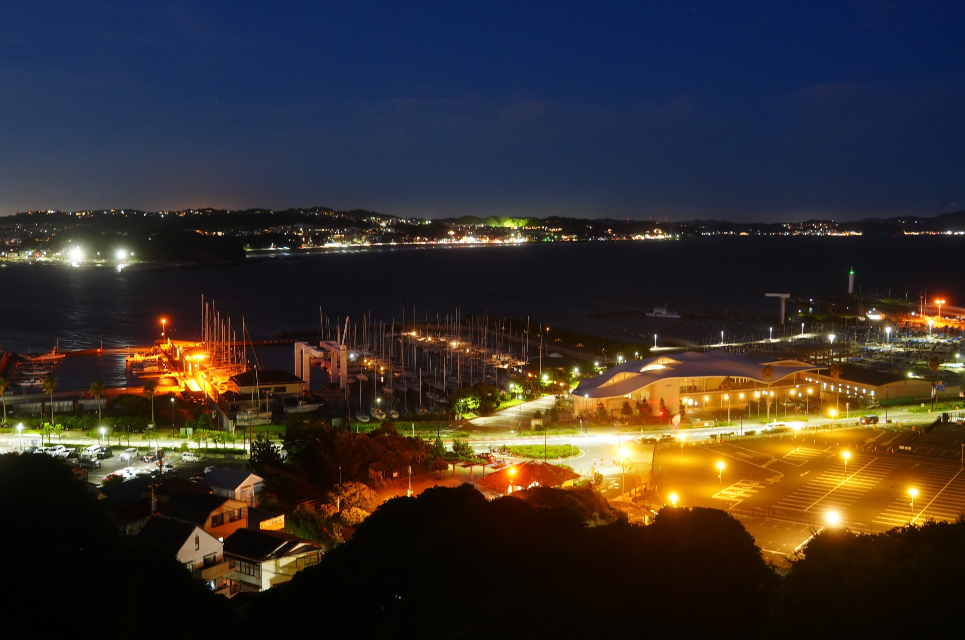 中津宮のあたりの階段からは、対岸の七里ヶ浜周辺も見渡せる、江ノ島からの夜景!