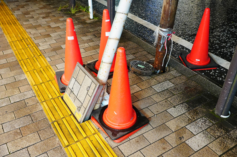 橋本商店街の歩道には、七夕飾りの竹と支柱を差して立てるための小さいマンホールが設置されています。